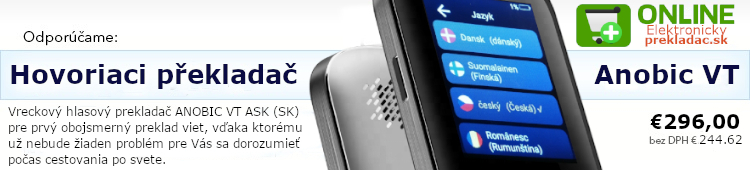 3 | Vreckový hovoriaci prekladač řeči a viet Anobic TL. Obsahuje aplikacie na vyuku jazykov (Anglicnina, Nemcina), testy a video kurzy. Dalej obsahuje elektronicke hovoriace slovniky: multijazycny, anglicko-slovensky a nemecko-slovensky 450 000 slov. | ![]() | €439,90 €399,90 | |